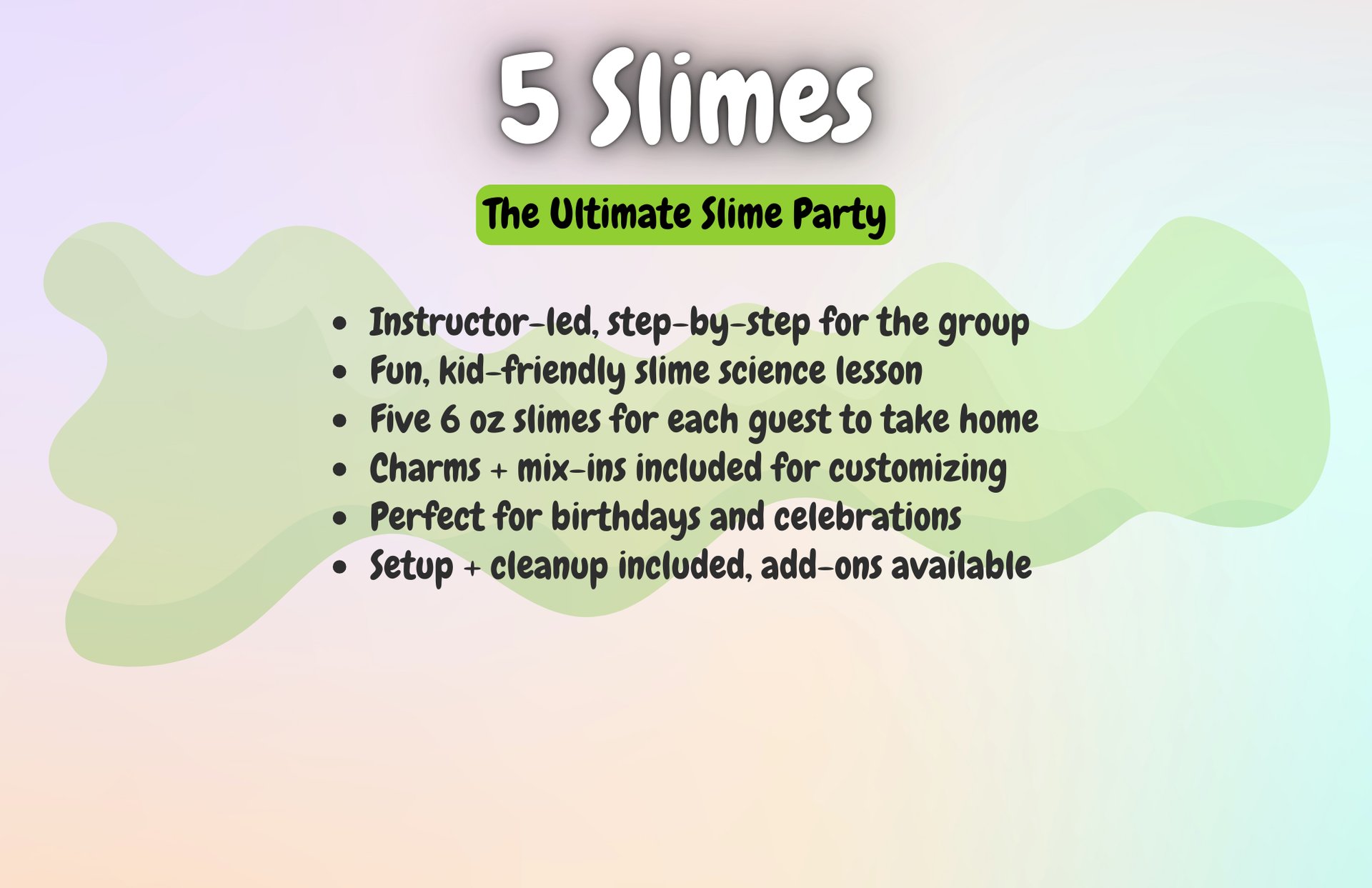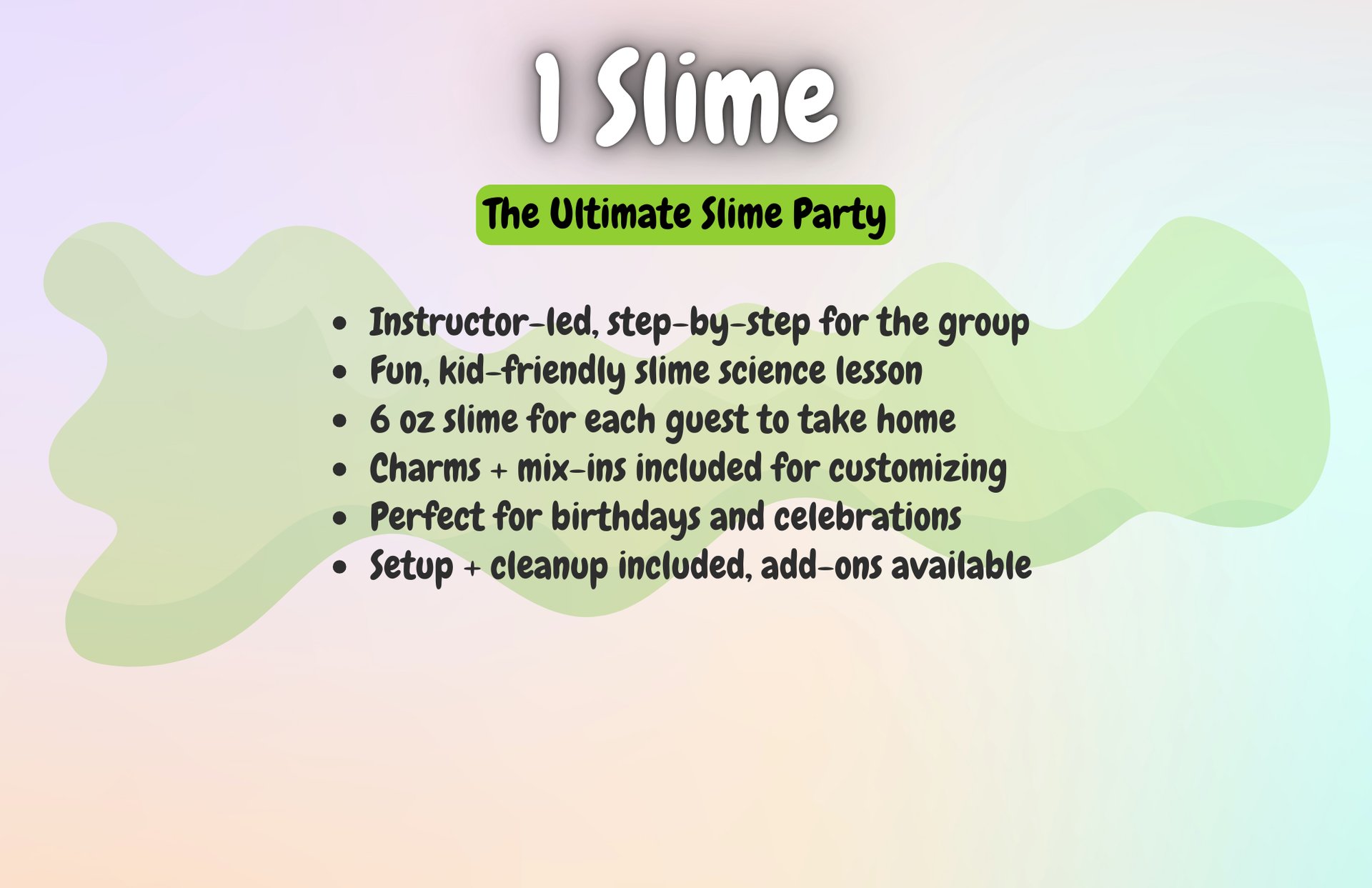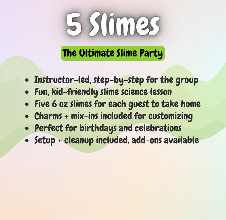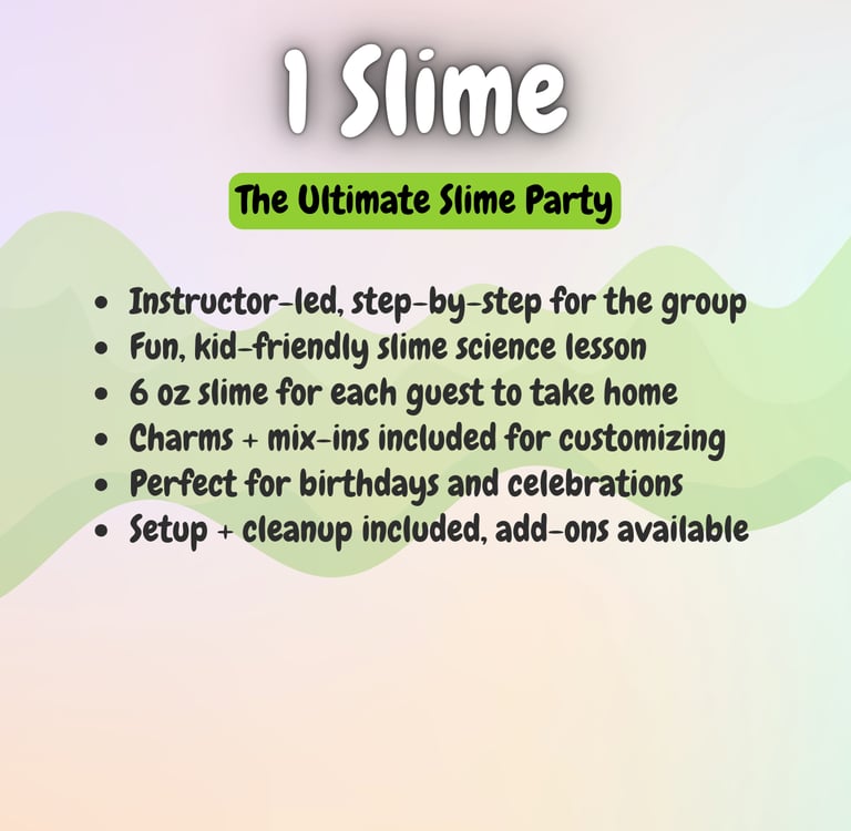 Want to level up your slime experience? Add-ons like extra slimers, personalized aprons, tables, or extra activities can be reserved right away through our add-on form, or you can wait for our personal planning call to make sure everything is perfect.