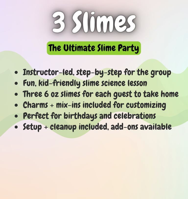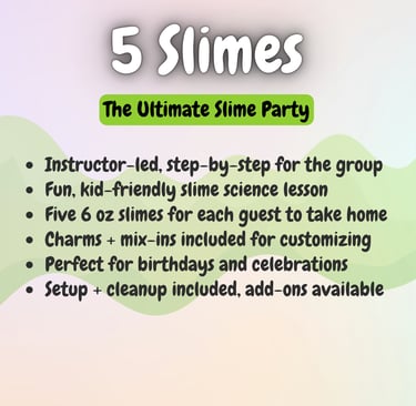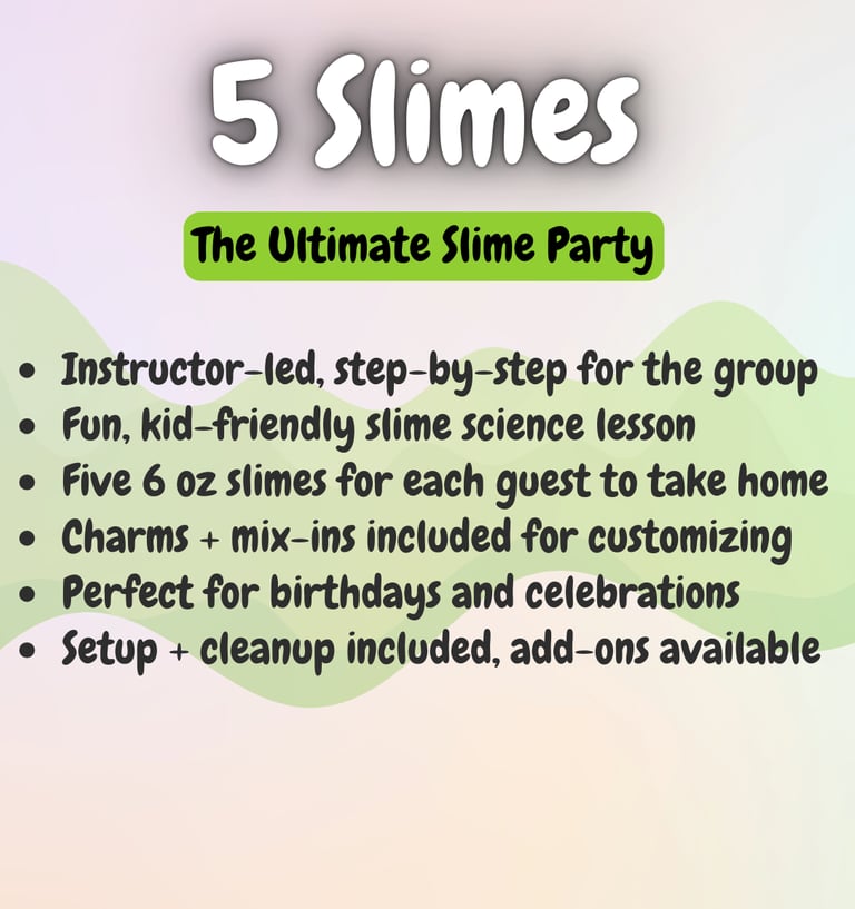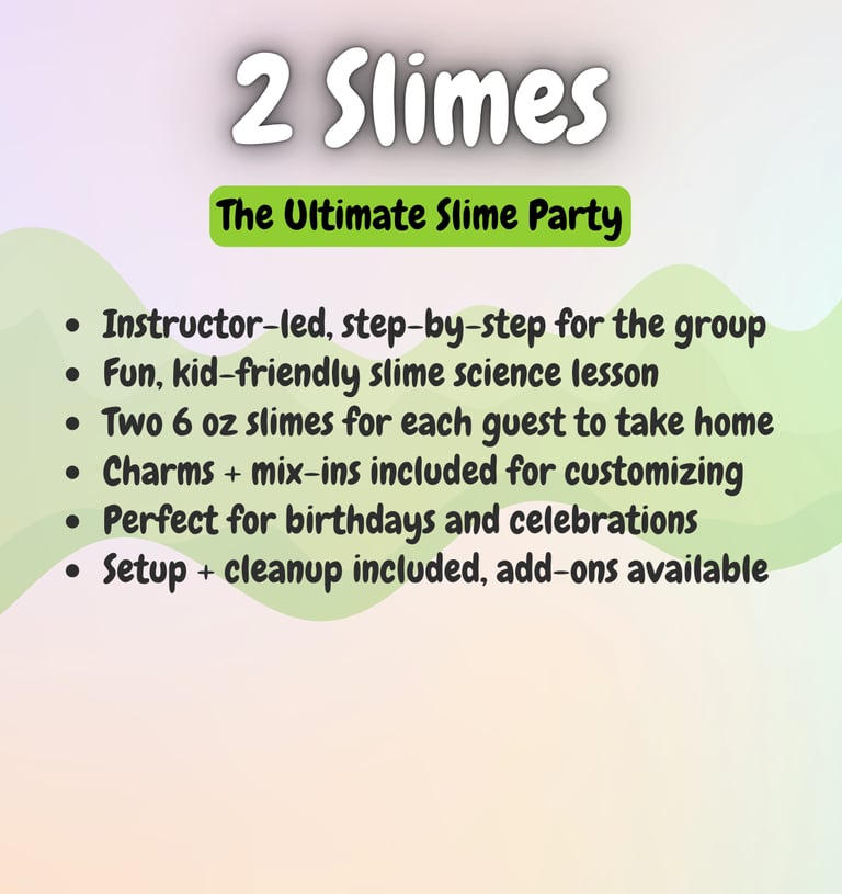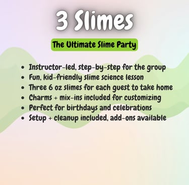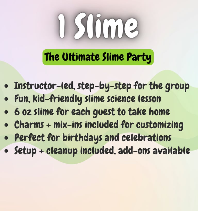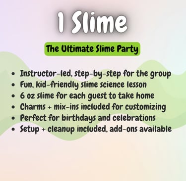Want to level up your slime experience? Add-ons like extra slimers, personalized aprons, tables, or extra activities can be reserved right away through our add-on form, or you can wait for our personal planning call to make sure everything is perfect.
